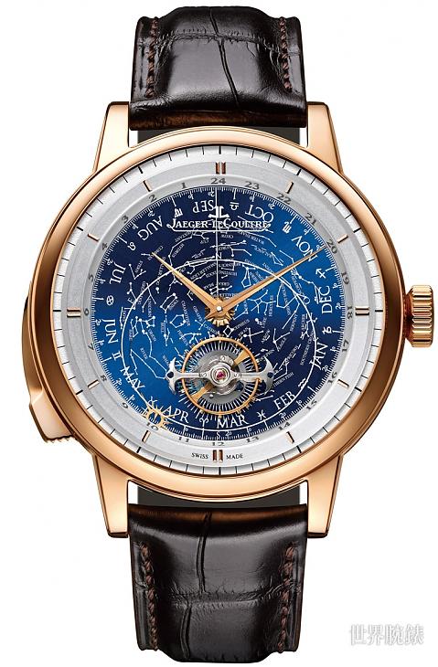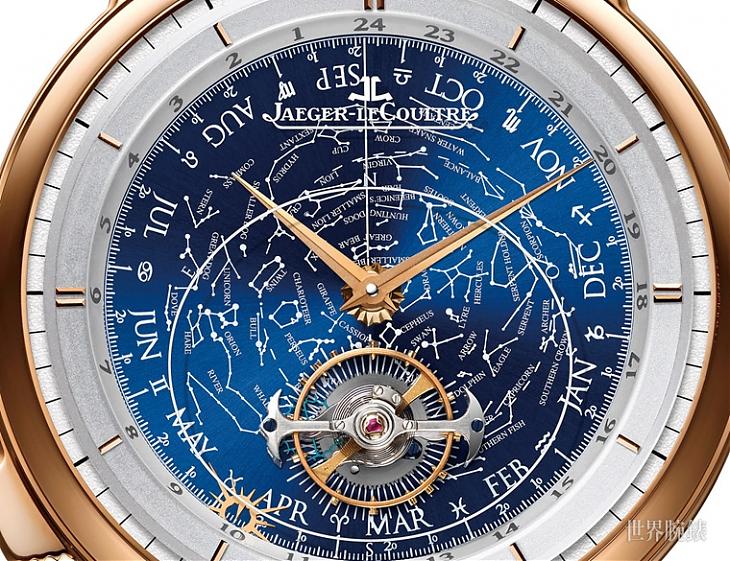 这款积家于2015年推出的超卓传统复杂功能大师系列腕表有着以缎面打磨的表壳、拋光表耳和凹形表圈 ,将十九世纪的优雅完美演译;此外,在面盘上可看到北斗七星、北极星、仙后座以及构成黄道十二宫的十二个星座,这些正是从北半球仰望可看到的天际星座,犹如将浩瀚宇宙浓缩于腕间。在蓝色天际最外侧,有一个像太阳的小圆盘,每24小时会环绕面盘一圈,刚好显示24小时制,利于判别白天与黑夜。如此精美的设计展现出积家表厂近两百年来的卓越技艺,并体现制表与天文学的悠久渊源。
