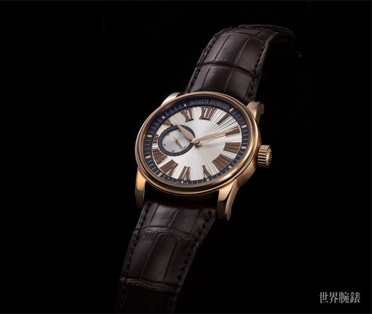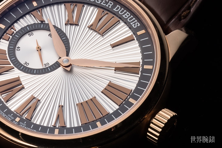 Hommage系列象徵了罗杰杜彼的精神,面盘风格自然也採用了品牌多年来自成一格的设计精髓。面盘装饰了中央太阳纹Guilloché鐫刻饰纹再搭配玫瑰金镶贴罗马数字时标,形成高辨识度特徵,兼具传统与现代的元素,散发出古典雅致的特质。