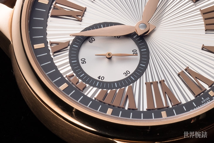 ▲ 别具一格的小秒盘设于面盘的9点鐘位置,饰以扭索纹,由中央向外扩散,特有復古韵味。