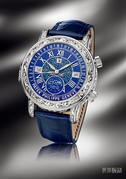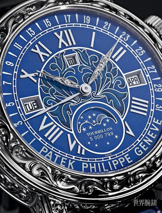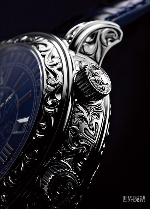 Ref.6002的表壳是以整块白K金原料,以手工花费超过一百小时的雕刻工时,做出带有微弧形的表壳、Calatrava十字星、蔓藤花纹以及细腻底纹,精致做工令人叹为观止。而从面盘上除了可看到时、分、逆跳日期、月相以及万年历资讯,这款腕表还具备叁问报时、陀飞轮、恆星时间与北半球天体、月相显示等12大复杂功能。