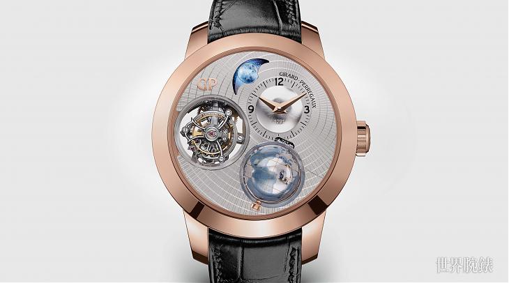 玫瑰金材质/GP09310-0001手动上鍊机芯/偏心时、偏心分、小秒显示/叁轴陀飞轮装置/球体日夜显示/月相显示/蓝宝石水晶镜面/防水30米/表径48mm/参考价:NT$ 10,720,000