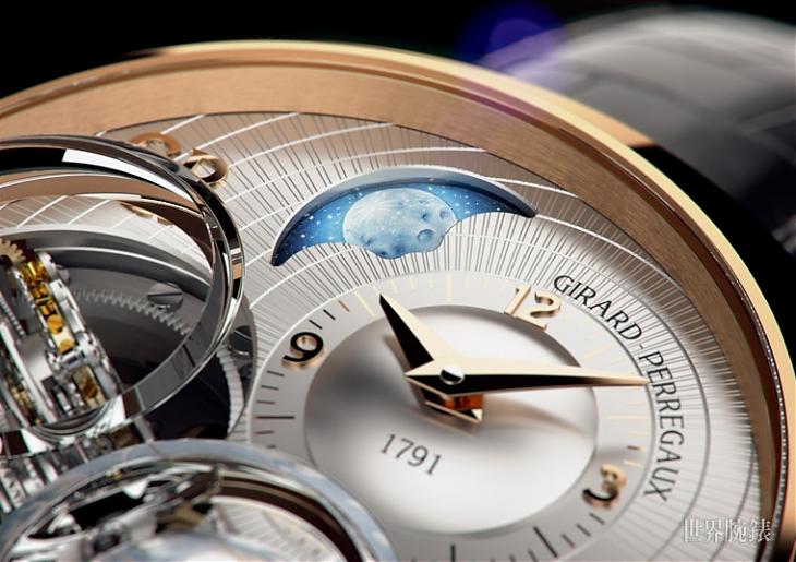 除了少见的叁轴陀飞轮,新作尚有双重天文显示也加入共襄盛举,包括24小时旋转一周的地球仪可即时读取世界各地的时间,位于直径13毫米铝制球体底部的箭头指标指向中午12点,用于显示日夜,面盘正面显示正处于白天的地方,背面显示正处于夜晚的地方。地球仪以微型绘画技术手工绘制,地图展现的是1791年的世界,这年正是品牌建立的年份。同样採用微型绘制的月相盘则展示了17世纪望远镜发明时的月相图,与旋转着的蓝色地球仪交相辉映,月相显示仅需每122年校准一次,可通过2时位置的一个微调按把进行调整。