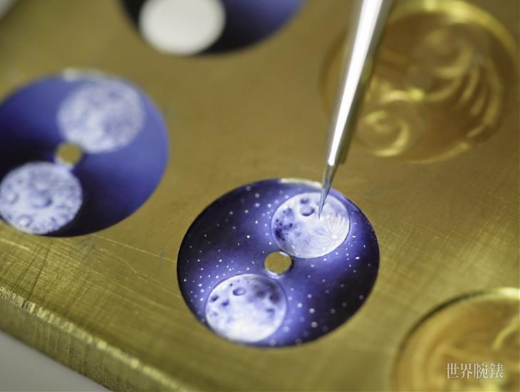 ▲有别于传统的月相转盘,天象仪叁轴陀飞轮乃是透过工艺师细腻彩绘而来,拟真程度让人叹为观止。