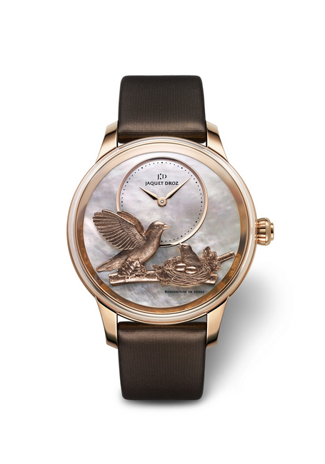 JAQUET DROZ的独特工艺,在啟蒙时代,JAQUET DROZ 制作的报时鸟让欧洲宫廷叹为观止。如今,JAQUET DROZ 制表厂以精心保存的独有手工技艺将这一珍贵歷史传承发扬光大,推出此款手表,堪称装饰艺术的崭新杰作。古色古香的黄金上以简单的几何线条雕刻出浮雕象形图案,象形图案源自古老传统,而JAQUET DROZ则将这一艺术杰作赋予Petite Heure Minute Relief手表。偏心小时盘和分鐘盘带来更为充分的创作空间:小鸟在面盘上振翅欲飞。对比鲜明的色彩引人注目,令手工制作的浮雕图案栩栩如生。