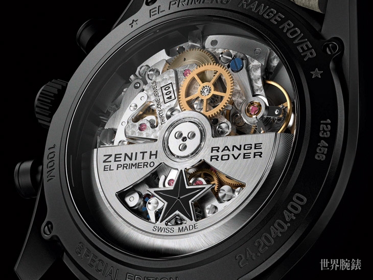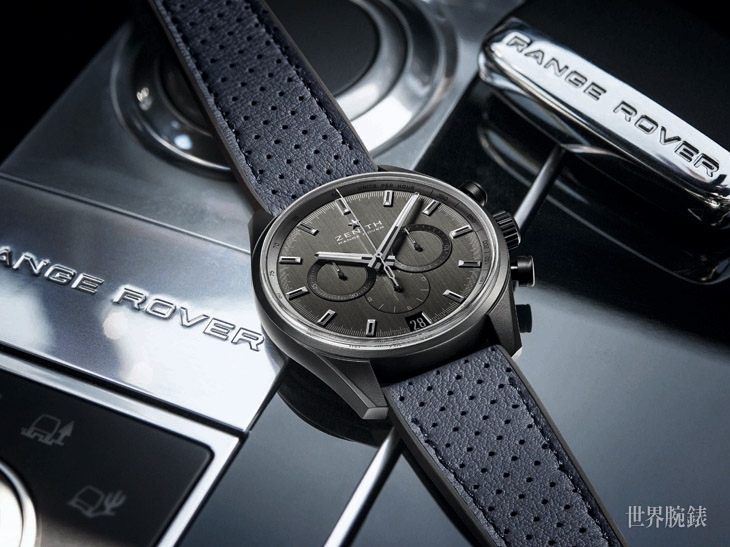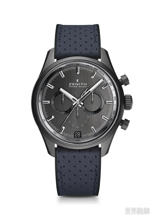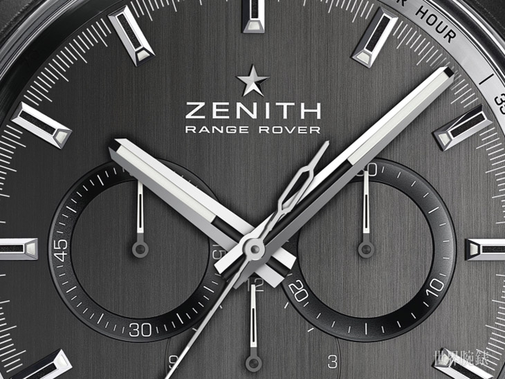 ▲ 灰色拉丝面盘上鐫刻"Zenith Range Rover"字样,时针和时标均进行镀銠处理并覆以夜光涂层。