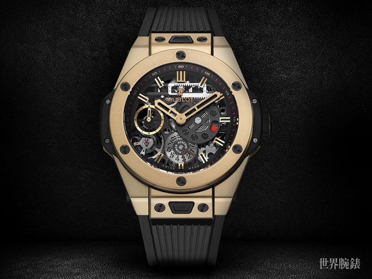 ▲ 魔力金材质 / HUB1201手动上鍊机芯 / 时、分、小秒显示 / 动力储存显示 / 蓝宝石水晶镜面、透明底盖 / 防水100米 / 表径45mm / 限量200只 / 参考价:NT$ 1,157,000