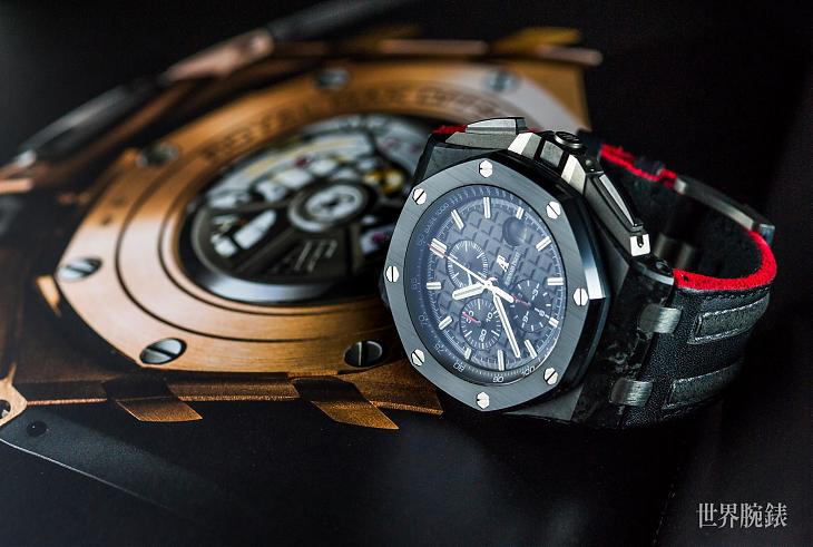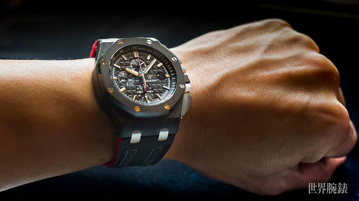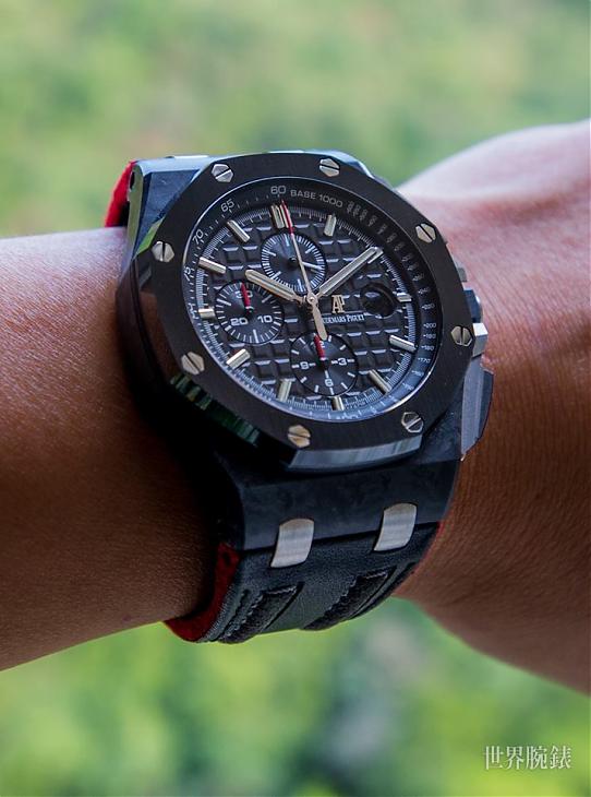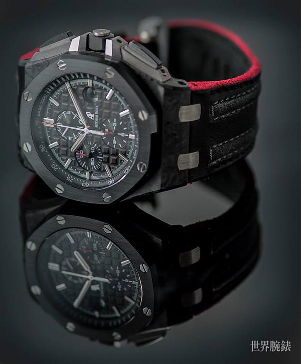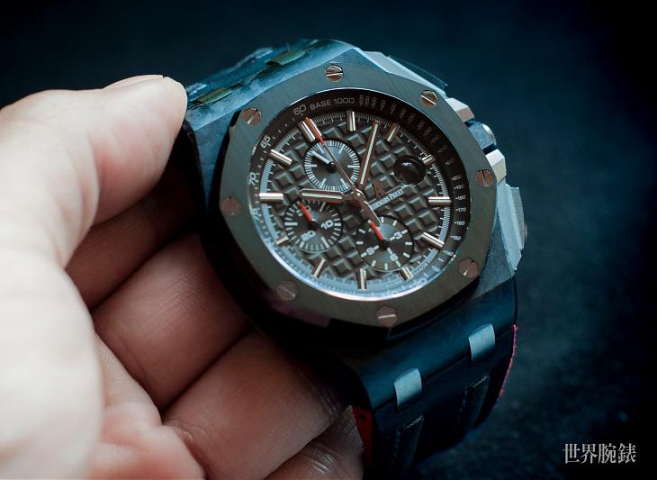 这款腕表的面盘,同样有系列最具特色的Méga Tapisserie超大型格纹,「立体饰纹为腕表质感提昇不少,且使整体视觉观感更为丰富」Dicky认为爱彼在有限的方寸面盘中,展现如此绝妙的格纹,别出心裁的设计看得出品牌的用心,从不同角度看上去,彷彿有光线与阴影交叠出美妙的光泽感。除了皇家橡树离岸型系列的经典设计,或许会发现面盘佈局不太一样,主要是因其搭载的机芯是用计时模组结构,会发现3点位置的日期视窗距离小表盘较远。品牌也为了提升识读便利性,特别採用放大镜的设计。另外,12小时计时盘、30分鐘计时盘与小秒盘分别位于6点、9点与12点位置;搭配立体时标与时、分针皆覆有夜光物料,无论在何种环境下都能轻鬆读时。