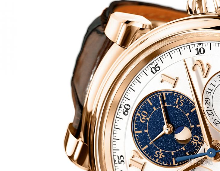 话虽如此但这款的月相还是跟旧款的不同,原本克劳斯万年历的月相是採用古典的伞形窗,不过这款的却改成了在固定的圆窗底下以移动的月影表现月相的形式,同样是月相显示,两者各有巧妙。另一方面为了强化月相的存在感、让它跟所在的子面盘更有一致性,整个计时时分盘都採用了跟月影相同的深蓝色和满天星点,因此这一块很自然地成了表面的焦点。