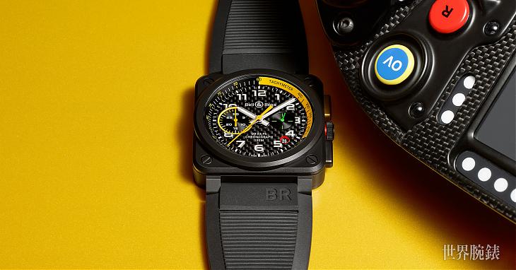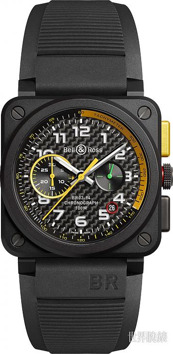 刚曝光的BR03-94 RS17计时码表,集先进技术与赛车界的创新物料于一身:其陶瓷表壳可以抵御撞击,碳纤维面盘象徵活力澎湃的赛车世界,极为轻盈而坚硬的碳纤维物料亦与雷诺的一级方程式赛车 (或R.S.17赛车)的方向盘相呼应。面盘最外围设有测速计刻度,以雷诺车队的代表色黄色点缀于其上,设计巧思流露出赛车竞速的动感,意义非凡。
