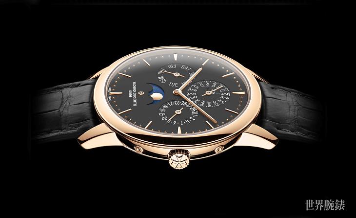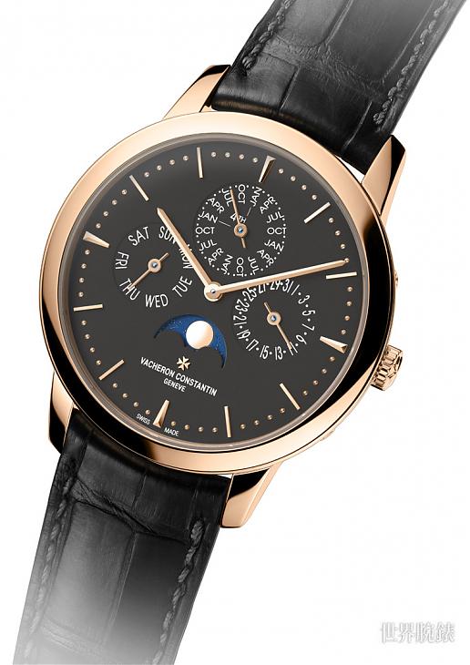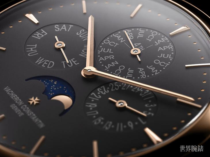 VC这款超薄万年历首度现身于2011年,当时以18K玫瑰金之姿,辅以斯文彬彬的白色面盘,搭配品牌招牌的立体珠粒式分鐘刻度,满满的古典气息不由分说;2016年,又再度看到这款超薄万年历的时候,这时却以限量100只的铂金白面款面世,这两款由于材质的差异,因此整体氛围也予人完全不同的感受,铂金白面款的面盘表面採用精细的喷砂工艺,加上四点鐘~五点鐘位置特别鐫刻的「Pt950标誌」,或许因为是限量,所以从表款的每个细节来看都显得更有层次许多,而这次2017年所推出的玫瑰金新款,则是以岩灰色的面盘登场,假如不仔细端详,有些表迷可能会误以为是黑面,这种在面盘上所想到的精细功夫,其实从VC的品牌脉络来看合情合理,但也正好和2017年各种品牌所吹起的面盘技艺风不谋而合,各家大展拳脚施展小改款的同时,也在制表工艺上走得更为细腻,足以让表迷大饱眼福一番。