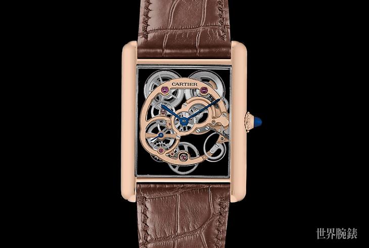 此款坦克鏤空表,虽没有漂浮的指针,但其实也运用了神祕表概念,利用蓝宝石水晶增加鏤空通透度,仔细看可发现此表机芯漂浮在表壳中,只有龙芯与表壳稍有连结,可说是通透至极。