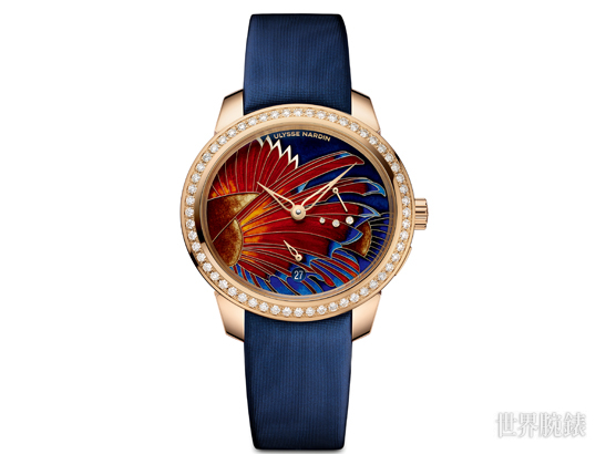 雅典玉玲瓏系列所搭载的UN-310机芯是雅典表第一个专为女士设计及制作的机芯,同时也是第一只考虑到女士在操作腕表时,加入保护指甲的贴心装置。透过创新的表冠设计:佩戴者无需拉出表冠,只要转动表冠,便能为腕表上鍊、向前和向后调校日期和时间。它面盘上的叁点鐘位置有精美的叁颗钻石,就代表表冠对应的功能。在2017年全新玉玲瓏上,雅典也特别加入珐琅工艺,以大明火珐琅、掐丝珐琅及内填珐琅叁项来呈现。在掐丝珐琅及内填珐琅的部份,特别选择以火红狮子鱼及优雅水母来做主题呈现,不但符合雅典表一贯的海洋风范,优雅带着刺的狮子鱼及水母,体现了女性柔美却坚毅的性格。