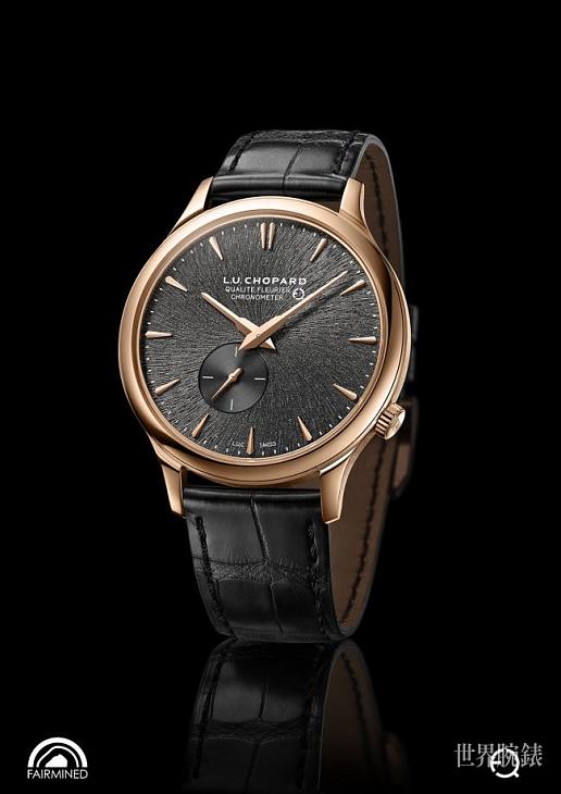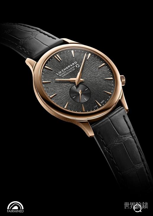 萧邦L.U.C Twist QF Fairmined小叁针以18K玫瑰金打造表径为40毫米的表壳,它的外观依旧持续萧邦制表的独特优雅。厚度仅7.2毫米的表壳将纤薄进行到底。表壳两侧也经过锻面拉丝处理,想必这份超薄的绅士典雅风范又将会掳获不少人的心。特别的不只如此,来到这只小叁针面盘的部份,我们会发现面盘上的特殊纹路也是十分引人注意。铁灰色的面盘上印有旭日纹理,看上去宛若不断放射出而的螺旋纹,为面盘增添了不少质感以及辨识度。实际上,这个面盘的创作灵感是来自从矿场所挖掘出的金矿的原始成份。所以这只小叁针可说是从头到尾都紧紧与Fairmined主题遥相呼应。不过萧邦其实在早前便有推出相似的表款,但新本与前作不同的点便在于小秒盘位置的变动。我们现在所看到的全新U.C. Twist QF Fairmined小叁针做了偏心设计,小秒盘被移至七点鐘位置,而且时标刻度的设计也更为简单明瞭。另外,这款全新小叁载搭载的是L.U.C 96.09-L自动上鍊机芯,该枚机芯的动力储存长达65小时,并且同时经过COSC与QF认证,十分可贵。最后,这款风格简洁利落又不失大气风范的小叁针腕表限量共250只。