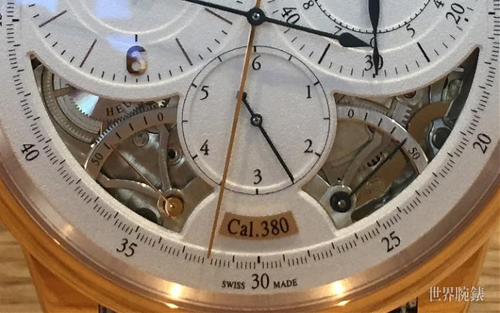 ▲表面下半部的左右分别是走时和计时的动力储存显示,值得一提的是机芯的两个发条盒都位在上方,储能显示做在这裡离发条盒相当远,结构上当有其特殊之处。