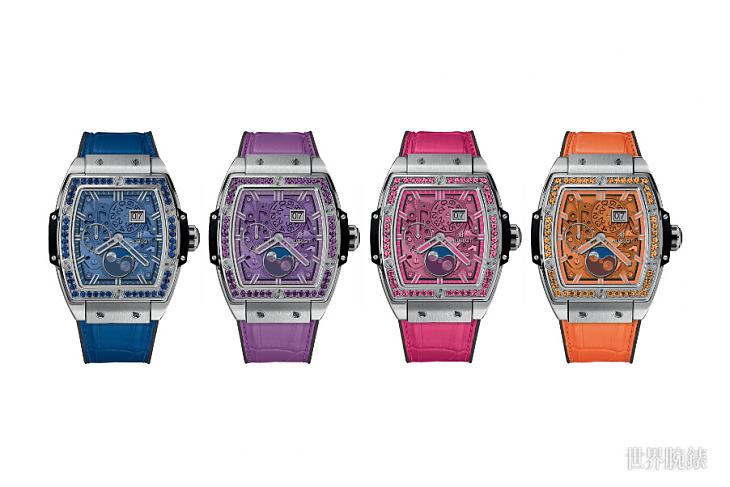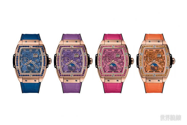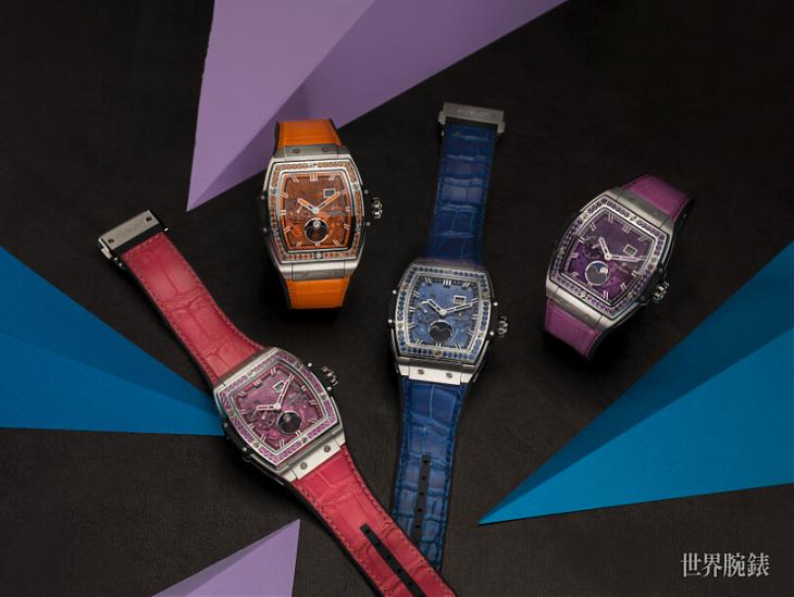 HUBLOT宇舶表将擅长将色彩融入制表中,因此在2017年的巴赛尔鐘表展上,宇舶推出了全新Spirit of Big Bang Moonphase月相表,透过该系列,我们可以看到宇舶将蓝色、紫色、橙色与粉红四种不同色系注入其中。而且,从表带、石英结晶面盘、喷砂月相显示盘、指针、时标与石镶嵌表圈,全部搭配同一色调,创造出明艳动人的梦幻霓彩时计。