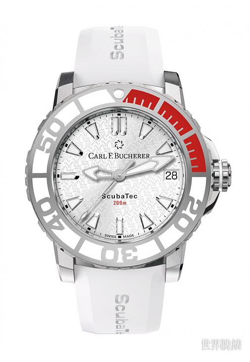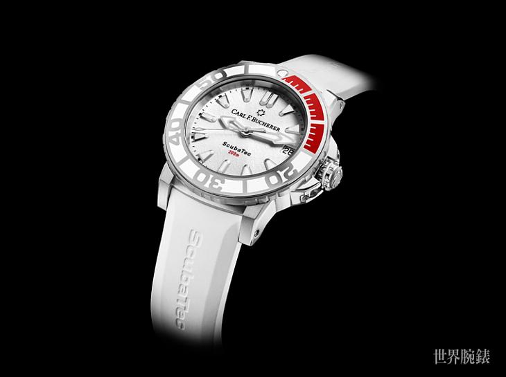 特别款女表融入瑞士国旗顏色,并以2016年面世的柏拉维深潜女表为蓝本,白色橡胶表带与面盘相衬,面盘上巧妙地鐫刻了瑞士足协标识以及代表防水深度的"200m"红色字样;表圈镶嵌有红白相间的陶瓷材质,表冠被红圈包围,这些精致的红色细节既彰显瑞士本色,亦增添几分优雅之感。