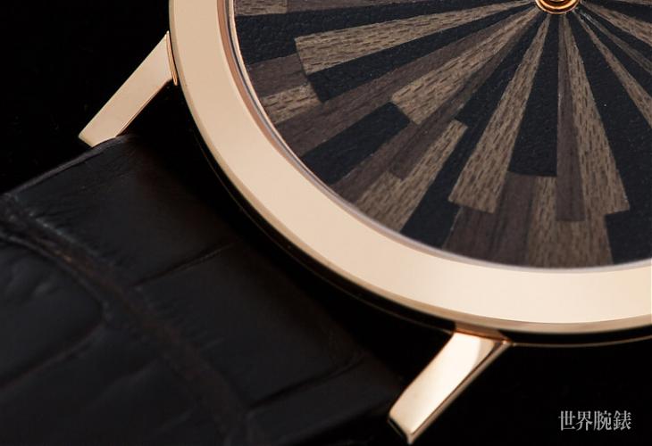 这款面盘拼贴的素材是皮革和木头,制作方法同样是将材料切割成指定的形状再加以拼凑组合成完整的圆形表面。技术上来说皮革和木头较之前提及的那些矿石来得柔软,理论上切割起来应该比较容易,也不会有碎裂的问题,然而这两种都是生物性的物料,防止后续变质、变色的防腐动作却是矿石类所不需要的,说起来是各有难处,所幸这些年表界对生物性素材的运用愈来愈广泛,鸟羽、虫翅等等所在多有,伯爵自己也做过不少,累积的Know-how应该相当丰富。