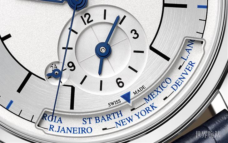 ▲表款以独立的12小时制时分盘外加日夜显示来表示第二地时间,第二地时间跟底下的世界城市名是同步的,旋转10点鐘的表冠时第二地的时针和城市环会同步跳动,技术上来说已经算是世界时区表了。