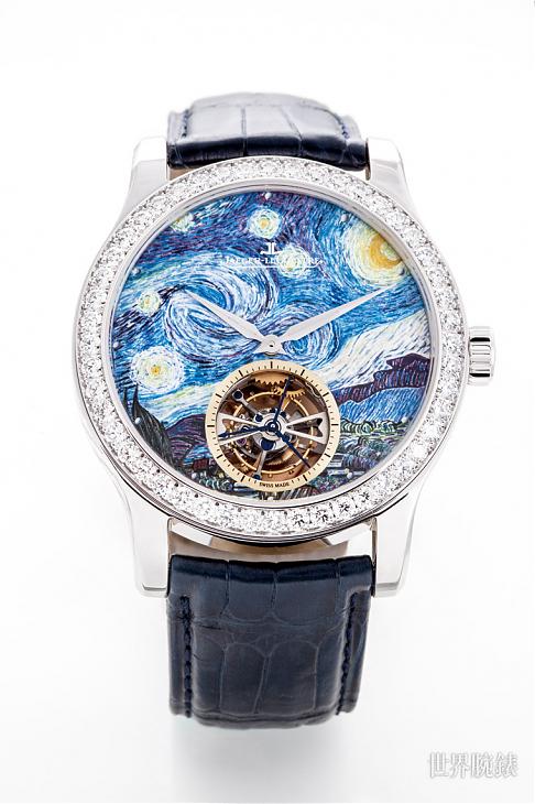 珐琅微绘将面盘的装饰提升至艺术创作的层面,但要去临摹梵谷的作品是否真的如想象中容易?梵谷最着名的画作多是在其生前最后两年间所绘,这时期的梵谷正饱受着精神疾病的困扰,而《星夜》正是他在南法圣瑞米疗养院进行治疗,将眼之所见的窗櫺景象化为画作的实例,在梵谷硬线条的强劲笔触下,窗前的树丛、云层与湛蓝夜空,皆深刻地传递出他躁动不安的情绪,他对特殊色彩的活用,以及厚实同时却活泼的笔触,正是积家彩绘师所面临的严峻挑战,然而,这正也彰显出这只腕表,为何得以如名画般被珍藏,因为它不仅仅忠实地呈现了梵谷眼底下的星空之美,更让珐琅工艺再次发光发热,这只积家大师系列陀飞轮梵谷星夜珐琅腕表MasterGrand Tourbillon Enamel Van Gogh,搭载曾在国际天文台计时大赛中夺冠的978机械机芯,限量仅仅18只,非常具收藏价值。