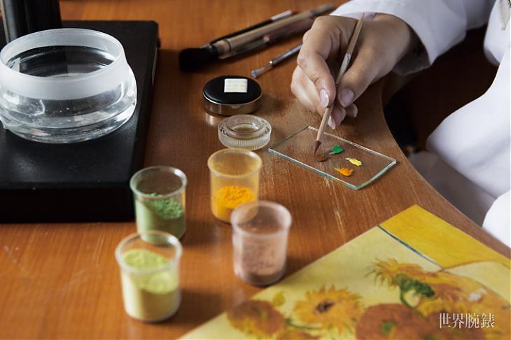▲积家隐藏式珐琅彩绘手表,面盘图案为梵谷的代表作品《向日葵》,微绘大师为精确临摹梵谷作品,将其作品置放于工作台作为参考。
