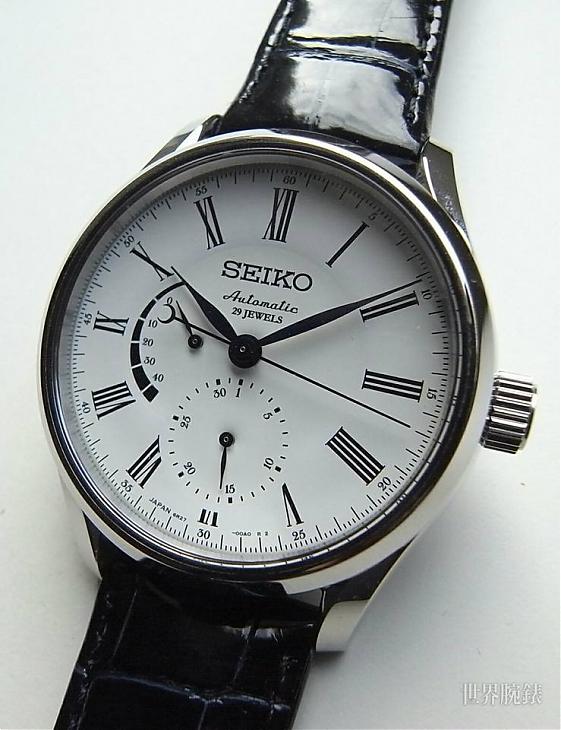 两年前SEIKO也曾经推出白色珐琅面盘的011J,採用1913年第一只腕表Laurel相同的珐琅面盘,同样有能量与日期显示(在6点的位置),依日本的资料特别强调是珐琅材质面盘,百年不褪色,我寧可相信它是真的,日本人应该不会骗人。因为售价非常漂亮,也不忍苛责了(即便是假的,也不会搥胸),才台币36800元,我相信这是地表最平价的珐琅表,我幸运抢到了一只,开心。