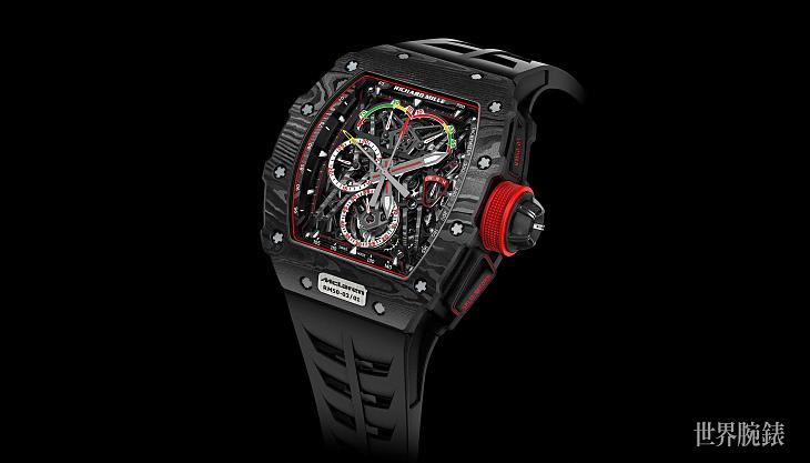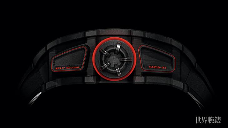 Graph TPT材质/RM 50-03手上鍊机芯/时、分、小秒显示/陀飞轮装置/追针计时码表功能/动力储存显示/扭力显示/表冠状态显示/蓝宝石水晶镜面、透明底盖/表径44.50×49.65mm/限量75只/参考价:约NT$ 34,300,000