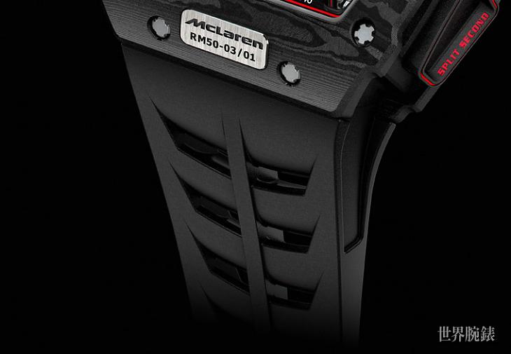 ▲RM 50-03的表带有胶带和鬆紧带两种,其中鬆紧带可以说是终极的轻量化了,不过用在高级表上还是满稀奇的;胶带中竟然也有加入石墨烯,其目的是为了增加弹性和抗磨性。
