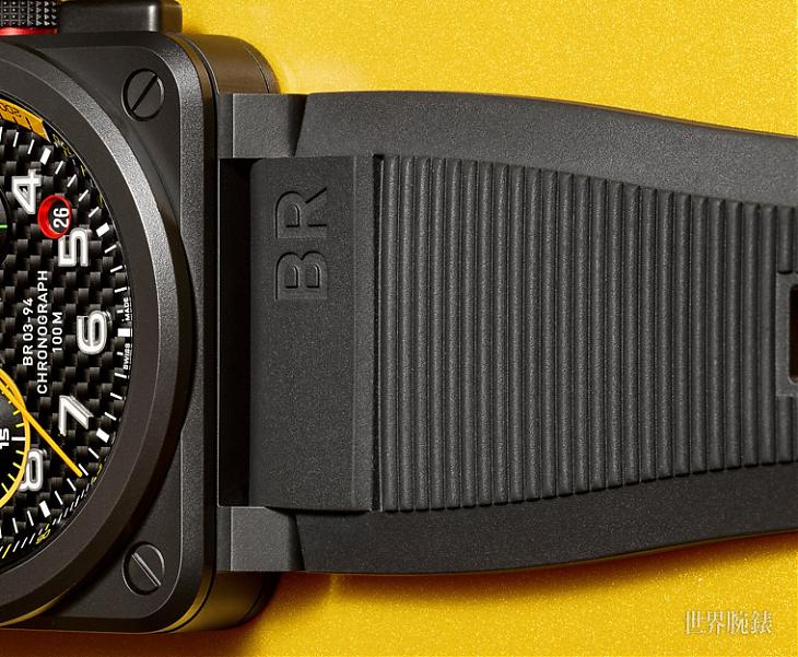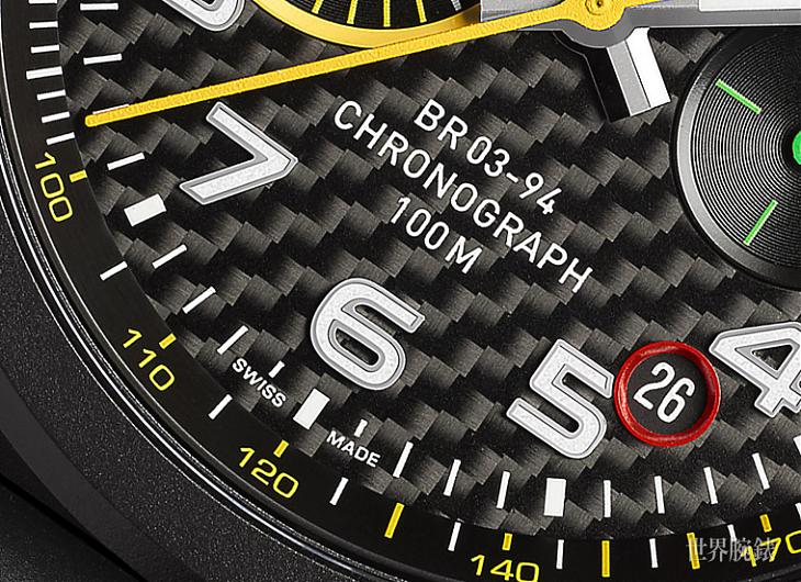 碳纤维面盘是赛车实际必备的元素,一般在运动时计上常见的搭配是碳纤维面盘与赛车仪表板的红色会出现在表款身上,其实碳纤维的使用也不是凭空而来,主要是因为赛车车体也採用碳纤维材质,藉此降低车身的重量,以此达到降低风阻、增加速度的优势,因此赛车时计很常看到移植自车体的碳纤维材质。当然,不得不说,多了碳纤维的使用,在盘面上可以说是画龙点睛,因为透过光线折射不禁显现出不同层次感的纹路,着实让人多了一种视觉上的享受,加上BR这次更独树一格的是,在表身上降低红色的比例,而以雷诺车队的代表色黄色作为视觉主要色彩,并添入了绿色等,这在一般赛车时计上还蛮特别的。
