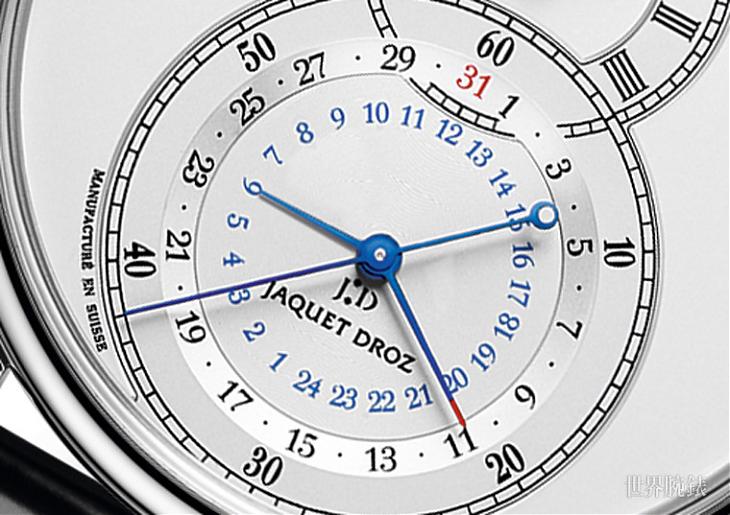 每次欣赏JD面盘,除了看每年出的多元材质面盘秀以外,招牌的大秒针系列也是不可错过的一个卖点,因为这是他们家沿用怀表传统所积累成的优雅佈局,所以这次多了两地时间以后,要如何在不改变这招牌佈局的状况下安排面盘,这对品牌来说不仅是内建机芯的难题,同时也是外显佈局的课题,所以JD最后选择在不更动十二点鐘位置的时、分指针,上表盘所显示的就是两地时间,而六点鐘位置的表盘则是第二地时间,更甚者两者以不同顏色标誌出两种层次,黑色罗马数字是当地时间,而蓝色日期只是则是第二地时间,最后日期显示则是以针尖为红色的指针指示,因此完成了这个看似复杂,但JD却以运筹帷幄的聪明佈局完成了这两个部分的难题。