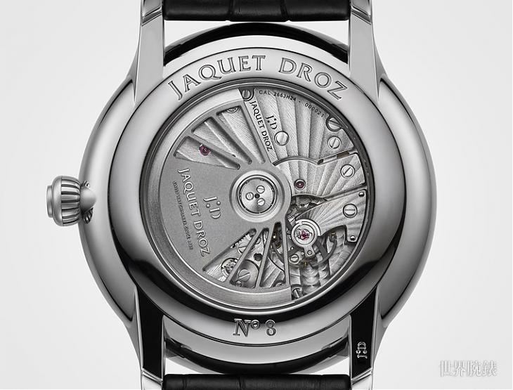 2663H24机芯是JD为了在招牌的大秒针系列加入两地时间功能而设计的全新机芯,不仅拥有抗磁耐用的硅游丝,更重新安排了机芯的空间安排,为的就是在不破坏原有的「8字形」优雅面盘设计下,加入这实用的两地时间功能,从表背透明底盖上,也可以看见JD特意减轻部分重量的半鏤空自动盘,以及那细腻的日内瓦波纹,2663H24机芯震频为28,800vph,动力储存共65小时,基本功能绰绰有餘,加上优雅大方的面盘佈局,内外兼修、相当精彩!