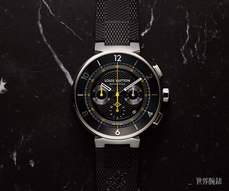 至于Tambour Moon Chronograph面盘使用叁眼格局,面盘上的装饰风格与GMT款雷同,而为了让计时与走时功能更易区隔,路易威登特别以黄色指针代表计时功能、银白色指针代表一般走时功能,在黑色面盘的衬托下,不论走时或计时都一目了然,浑圆的44mm表体本身运动感强烈,但是在面盘细节的处理上又能显现优雅特质,无论日常生活中各式场合佩戴都很称职。