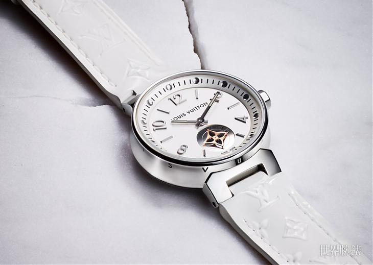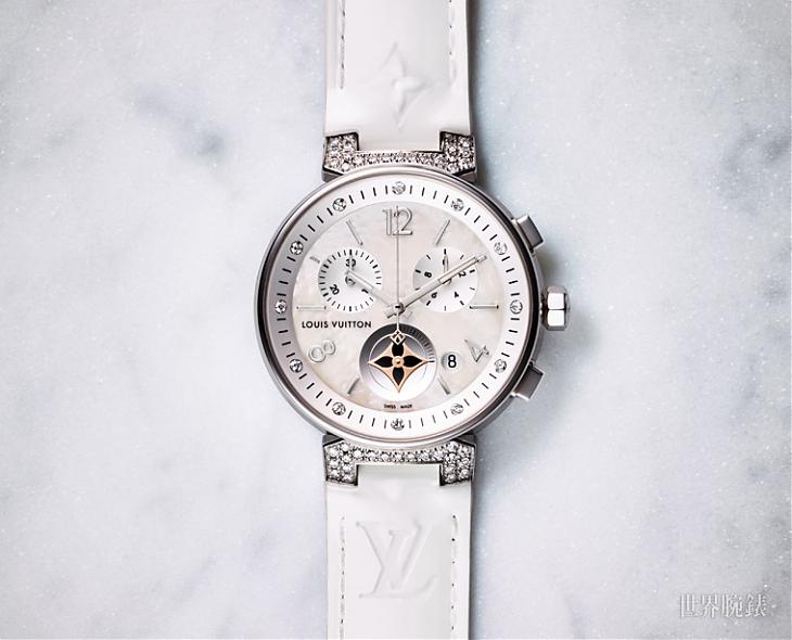 Tambour Moon Star女表亦有计时码表款式,并分成35mm和39.5mm版本,不同表径版本又有黑面或银白面的选择性,尤其部分款式还有表耳、刻度镶钻搭配珍珠母贝面盘的设计,华丽感十足,计时码表款与小叁针款同样将小秒显示改为花朵造型装饰,搭配原厂配置印有LV Logo和Monogram花纹的白色或黑色表带相得益彰,一次满足佩戴者阅时以及为自身造型加分的多元用途。