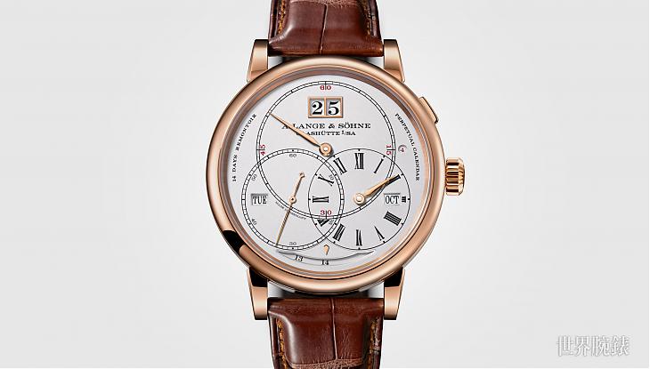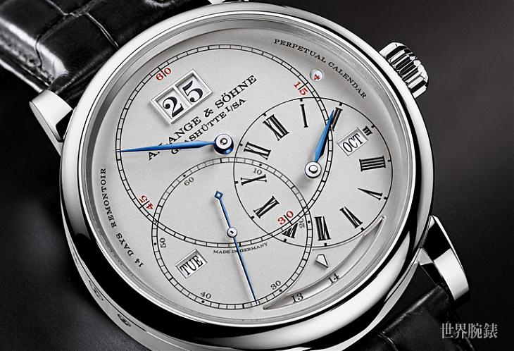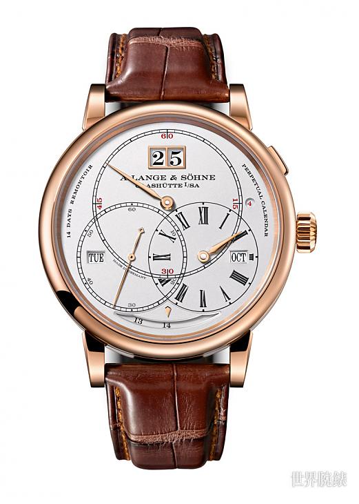 ▲表款除玫瑰金材质外,朗格一併推出白金材质款式,白金版本採用蓝钢指针搭配白金大日期显示框与动储显示指标的双色调能突显面盘视觉层次。