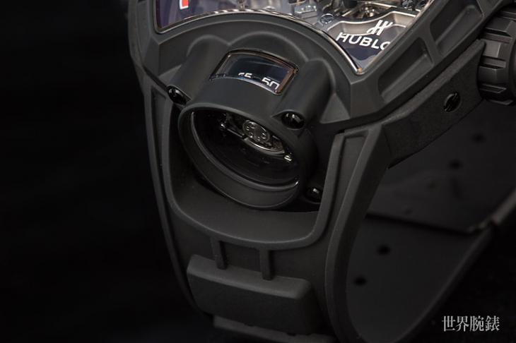 ▲表壳6点鐘的立面上还有一颗垂直陀飞轮,从这裡可以发现不论时分针的转速如何,调速擒纵机构都仍然维持一般恆定的运作速度。