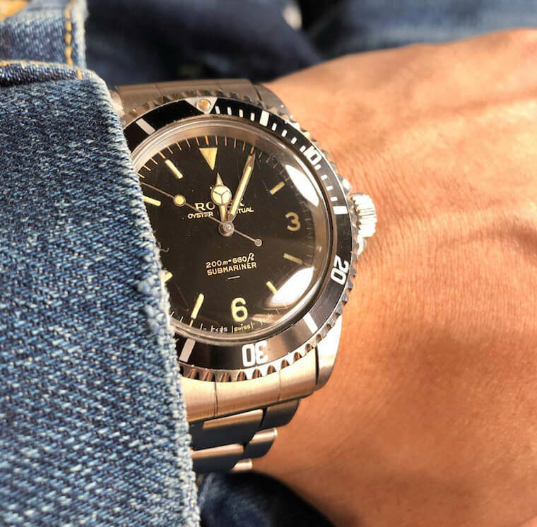 这款长的有点像是水鬼和探险家的综合体,从六点钟方向的文字看起来,这可能是劳力士在1960年代开始将镭元素的夜光物料替换成放射性较低的氚元素的过渡时期出产的5513水鬼,光是面盘上那3、6、9方向的阿拉伯数字时标,看起来就比现在市售的水鬼要特殊许多。
