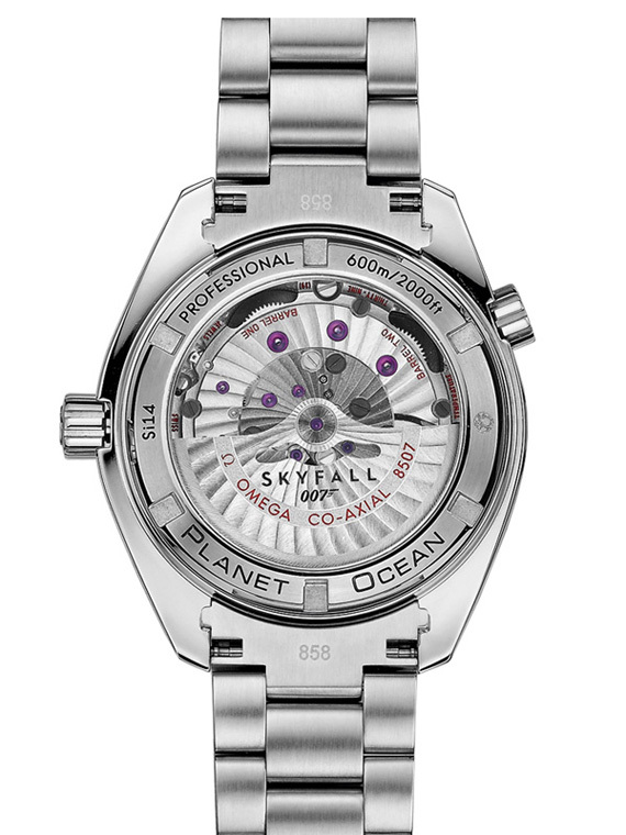 海马42毫米Planet Ocean SKYFALL 600米潜水纪念手表的动力来源,採用OMEGA自制8507叁层同轴擒纵机芯,此机芯原本为8500机芯,为呼应此部007电影巨作,特别命名此款机芯为8507同轴擒纵机芯,表款享有瑞士天文台认证,除了顶级计时性能,表款还具备60小时动力储存,机芯宝石数多达39颗,并搭载「Si 14」硅晶体游丝,以确保在任何严峻状况都能精准计时的防震装置。这款OMEGA机芯另一个会让庞德感到非常实用的特色是:时区功能。此功能可让佩戴者独立向前或向后调整时针,完全不会影响到当下分针设定,适合在穿梭不同时区时,迅速便利地调整整点时间。更可透过旋入式雾面底盘的蓝宝石水晶镜面,一览无遗机芯运转的美态。OMEGA更为此款表提供四年的国际保固。