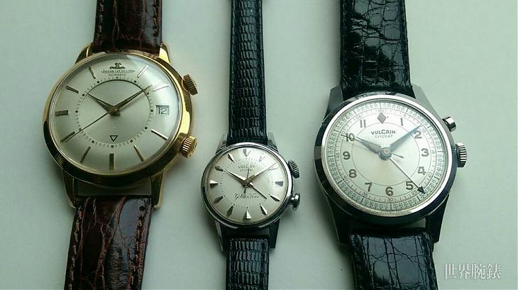 左边是积家1950年代18K古董自动闹铃表,右边是正常版的窝路坚闹铃表。