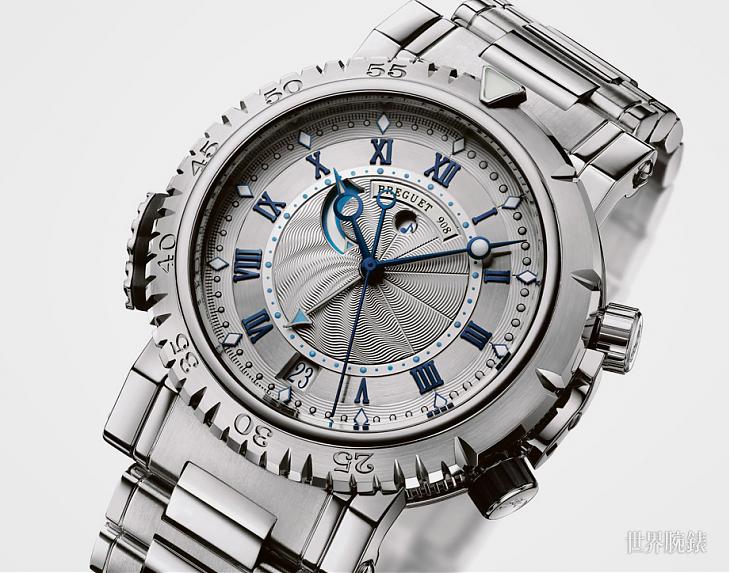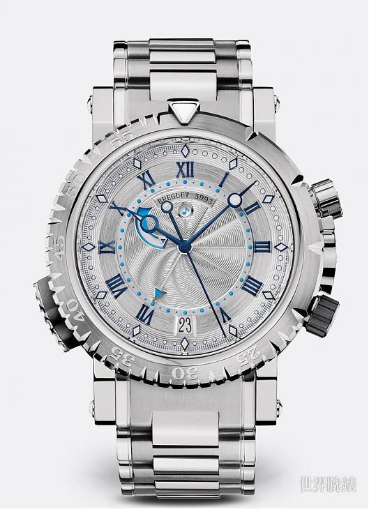 18K白金材质的闹铃设定表冠及开关按把外层採用橡胶保护,不仅便于操作,更为腕表带来一抺运动的优雅。当然,这款腕表也拥有普通潜水腕表的特点。如省略前20分鐘刻度的单向旋转表圈。位于表壳侧面的止逆棘轮确保了表圈的单向旋转。波浪造型让人立即将它与腕表的重要功能联繫一起。为提高腕表在最为黑暗的水下环境中的易读性,腕表的分鐘刻度、分针以及时针都涂有超级夜光涂层,而时鐘和闹铃刻度则涂有蓝色萤光物质。10时位置作为动力储备显示的蓝色叁角形指标同样涂有夜光物料。此外,Marine Royale 5847还带有日期显示功能及自动上鍊机构。白金腕表款式拥有经黑色镀銠处理的18K金面盘,面盘上则以手工鐫刻精美的波浪图案做为装饰。