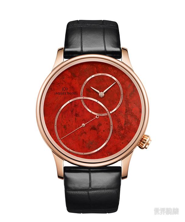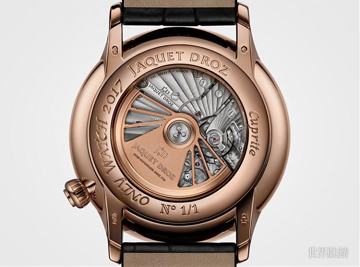 ▲为了替Only Watch慈善拍卖会贡献己力,雅克德罗以偏心大秒针系列为基础,特地选用赤铜矿材质打造面盘,并搭配高贵的玫瑰金表壳、指针与刻度环等加分细节。