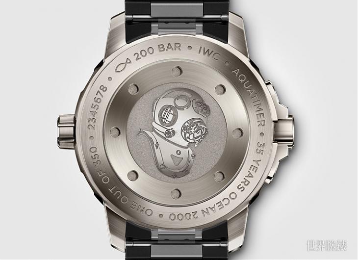 限量350只的海洋时计自动2000腕表「海洋2000 35週年」特别版(型号 IW329101)为IWC海洋时计系列中最纤薄的深海潜水腕表。此款腕表的表壳仅厚14.5毫米,却可胜任达2000米水深的潜水任务。外型经改良的鈦金属表壳成就了如此的工艺杰作。作为将鈦金属应用于表壳上的先驱,IWC在此种极轻且极富弹性的金属应用上,已累积了30年的经验。表背上鐫刻着深海潜水员所使用的潜水头盔,每天都向使用者宣示着它那足以抵抗200巴水压的极强效能。黑色面盘、白色萤光指针和时标、具有红色尖端的秒针等设计特色,皆啟发自海洋2000腕表。而表圈上突出的抓槽和纹层状的橡胶表带,皆酷似1982年的原始表款。