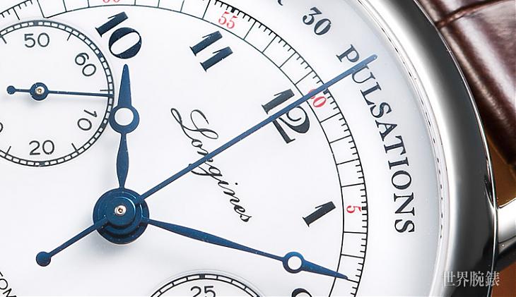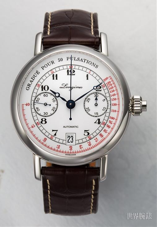 ▲LONGINES Pulsometer Chronograph计时码表的指针配合脉博计刻度,可以在脉搏跳动30次后清晰地在面盘上显示出病人的心率。