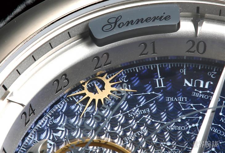 叁问报时则是表款的另一亮点,沿用Master叁问表开发出的水晶音簧技术,方形的切面可扩大与音锤接触的面积,提升敲击品质。并採用大自鸣腕表开发的天平锤设计,在音锤尾端连接一条钢索与音锤加上一条螺旋游丝,可使动力传导提升至80%,让音锤更具力量,因此当叁问功啟能动时在音量、音质上皆更为突出,谱出美丽星空面盘下的动人乐章。