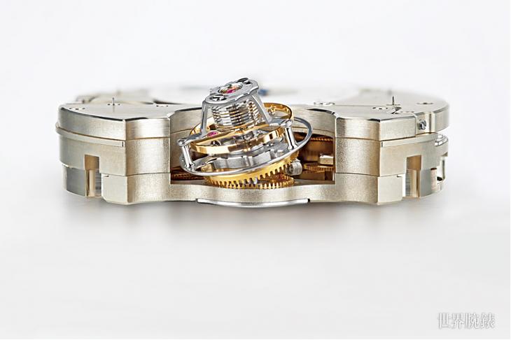 虽然球体陀飞轮叁号又延续一号转速,但游丝却是以二号与双翼球体陀飞轮筒状游丝为基础的球状游丝。此外,为了减少转速与方位差的限制,积家在陀飞轮框架制作上格外用心,运用了鈦、铝、镁等金属,特别是球体陀飞轮叁号无论内外皆採用超轻质铝合金打造框架,不过0.43g的重量相当惊人。