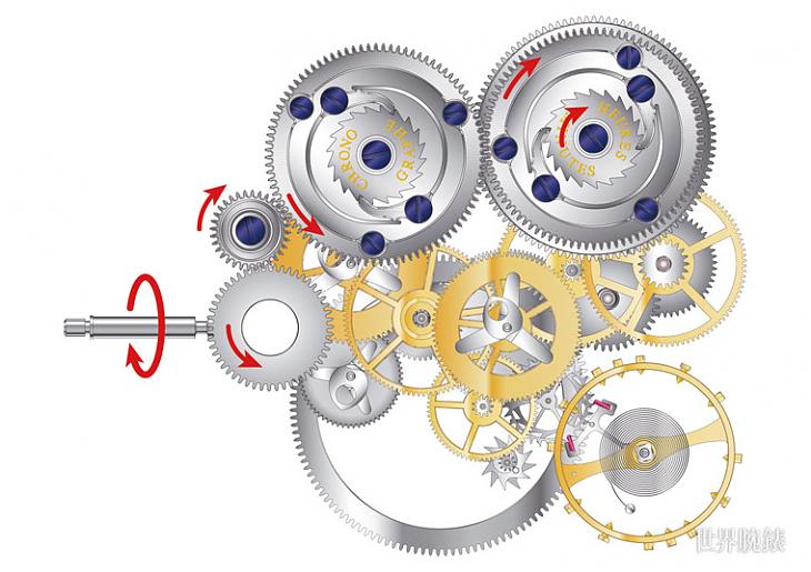 2004年首发的球体陀飞轮可谓积家无人能出其右的技术,挑战了18世纪宝璣大师创制的传统陀飞轮,虽然陀飞轮可均化因不同重心对擒纵结构运转造成的偏差,但别忘了那是怀表年代的发明,传统陀飞轮以平面旋转居多仍有其限制。因此积家设计出以两个呈九十度的轴心框架内外各自旋转的立体陀飞轮,透过外圈框架每60秒旋转一圈,内层陀飞轮框架每24秒旋转一週,让整个擒纵装置在叁度空间高度旋转。2008年推出的球体陀飞轮二号则是内框加速至18.75秒为一圈,2012年的Duomètre Sphérotourbillon外部框架每30秒旋转一圈,而内部的擒纵呈现20度倾斜再以15秒自转一週,旋转速度之快更胜球体陀飞轮一号与二号。