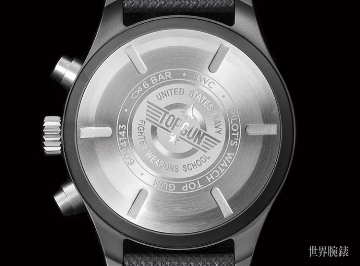 ▲表壳为陶瓷材质,不过底盖和表冠、按把等等部件则是鈦金属;底盖的Top Gun Logo上一代是彩色的,这次则改成金属本色。表带由帆布带改成牛皮压纹的做法。