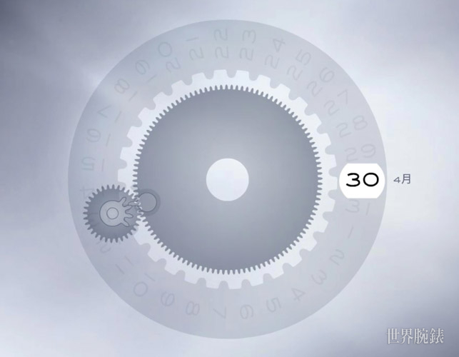 ▲Cal. 9001以劳力士自家Cal.3135为模组增设二组轮系共四个齿轮,与日期盘连动的卫星齿轮每30天绕行中央轮系一周,每到月份之交,8点半鐘位置的换日装置即会推动日期盘。