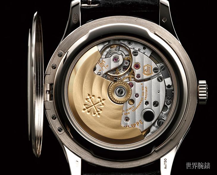 表背的军官式底盖是Ref. 5227G的另一记忆点,由于少了表冠护肩,无法像Ref. 5153得以将护盖铰鍊隐藏其中,但品牌又不希望影响表壳造型的流畅度,遂产生将铰鍊内缩置于表背9点方向的改良设计,只有在佩戴者掀起军官式底盖时才会露出铰鍊与固定螺丝等接合零件,一旦将表盖復位后,表款便宛如实底盖般不易察觉其下仍别有洞天——意即精准度通过PP印记-3~+2秒标准考验,以及拥有媲美日内瓦印记般的高水准修饰工艺之324 S C机芯。