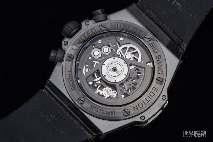 ▲这是一枚充满HUBLOT色彩的机芯之一,藉由HUBLOT Big Bang Unico黑色蓝宝石彩宝腕表无论从正面或背面都能欣赏到机芯的精巧结构。