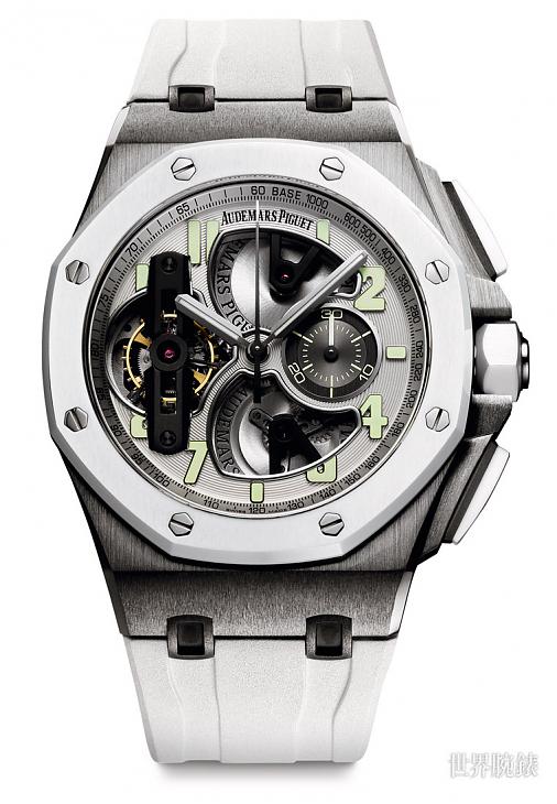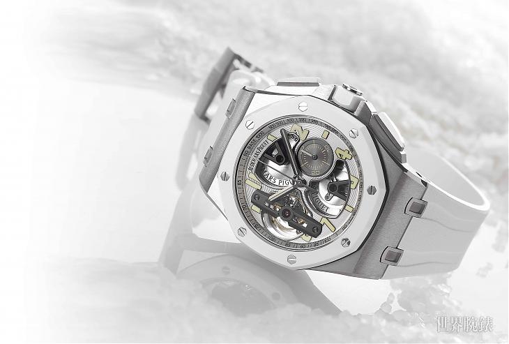 ▲皇家橡树离岸型陀飞轮计时码表自初登场以来,每每以富视觉对比效果的异材质组合而令人感到惊艳,此次最新改款则运用鈦金属与白色陶瓷呈现有别过往的优雅形象。