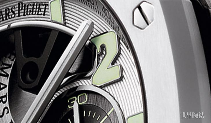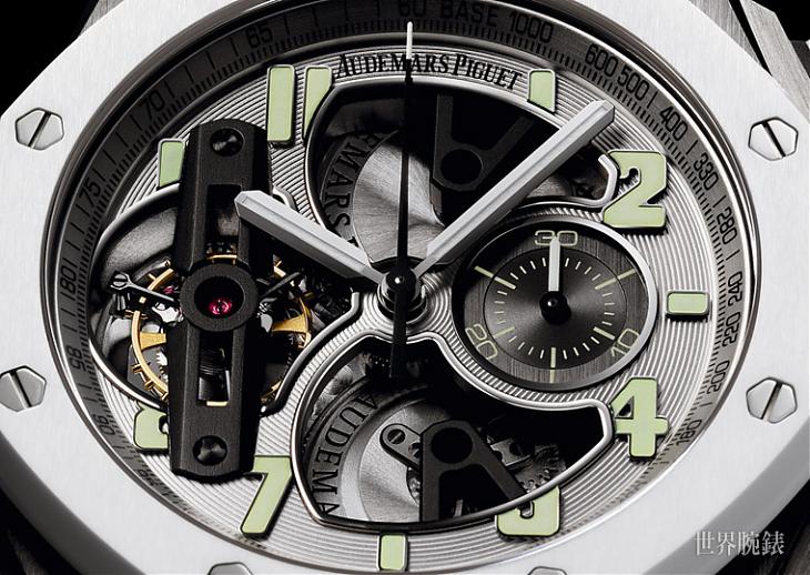 有别于先前款式曾尝试过包括玫瑰金搭锻造碳,或是铂金搭黑色陶瓷等异材质设计,这款皇家橡树离岸型陀飞轮计时码表则是换上轻盈且低致敏的鈦金属表壳,搭配爱彼近年研发有成的白色陶瓷材质表圈,此外包括计时按把和表冠部分也都是白色陶瓷材质,结合白色橡胶表带展现出一派斯文优雅的气质。表款面盘的同心圆螺纹此次也改换为银色,形成和谐的浅色调组合,至于先前系列惯用的白色系时标与指针夜光涂料也被替换为萤光绿色,此举强化了面盘的视读效果,也能避免同为单一色调的沉闷感。
